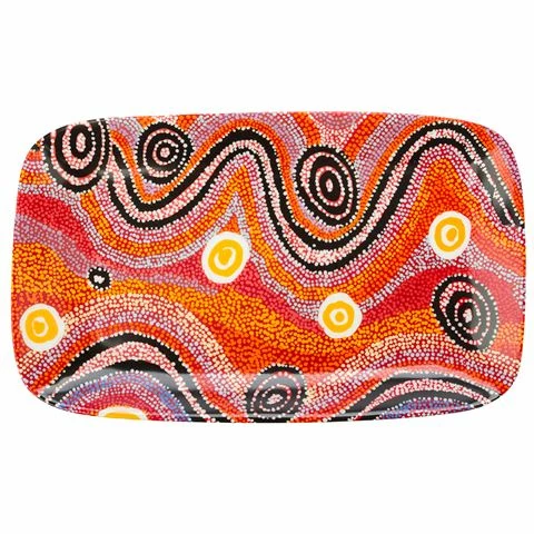 When it comes to souvenirs, there’s nothing scarier than those silver tourist teaspoons with a picture on the end… Put those away quietly and take out something still very Australian and much more beautiful: an Alperstein Plate. Made from fine bone china, this lovely long plate is decorated with a beautiful artwork from Otto Jungarrayi Sims, it is the perfect piece to showcase at your next dinner party, and can even serve as a traditional display piece for your home.