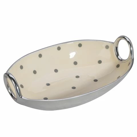 The Polka Dot Grey & Cream Oval Bowl with Handles features grey polka dots within the interior. With a silver metal finish on the exterior, this oval bowl also features handles on the sides to make carrying easy.