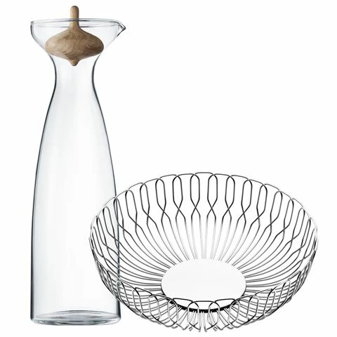 The stainless steel of the bread basket mimics the patterns seen across the range, while the delicate lines of the glass carafe are finished with a “floating” oak stopper, creating two everyday pieces that bring joy to the smaller things in life.