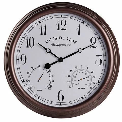 The Bridgewater Outdoor Clock has metal effect surround with built in thermometer and humidity dial. Fully weather resistant for indoor or outdoor use. It adds a classic look to any garden setting.